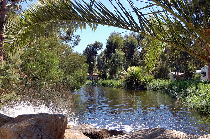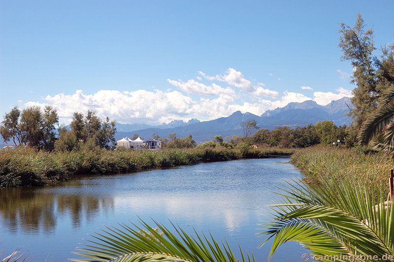 Zwischen der Rezeption am Eingang und dem Gaststätten- und Einkaufsbereich am Meer erstreckt sich das Platzgelände um einen kanalähnlich angelegten Teich. Rechts neben der ansprechend gestalteten Rezeptionseinfahrt befinden sich über einhundert unter Bäumen versteckte Miethütten, Mobil-Home Loggia genannt. Es folgen etwa eben so viele Stellplätze für die Camper unter hohen Bäumen, dem Bewuchs angepasst und von Buschwerk begrenzt.