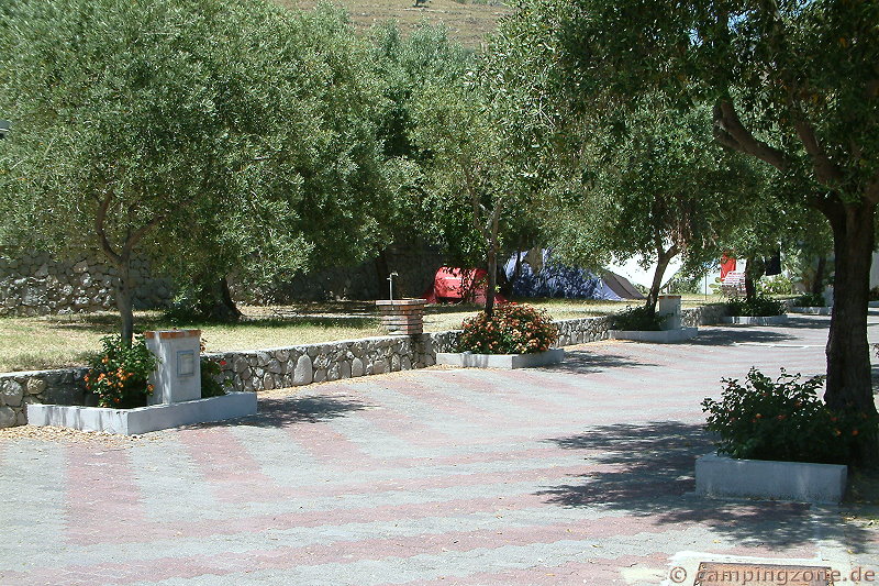 Die Stellplätze befinden sich in einem Olivenheim, sind entlang zweier gepflasterter Wege rechts, links und in der Mitte angelegt. Ihre Größe im mittleren Teil ist ausreichend für Caravan, Vorzelt und bei geschickter Einteilung auch noch für das Zugfahrzeug. Rechts vom Eingang, erreichbar über die Zufahrtsmitte gibt es noch einige Terrassenstellplätze unter Mattendächern.