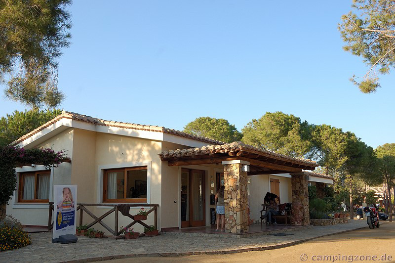 Eine kommunale Straße teilt den großen Campingplatz in zwei Areale. Im rechten befinden sich Rezeption, Restaurant, Pizzeria und am Ende der ca. 150m langen Straße ein Supermarkt und ein weiteres Restaurant mit Taverne. Dazwischen liegen im schattigen Pinienwald die Stellplätze und Mietbungalows.